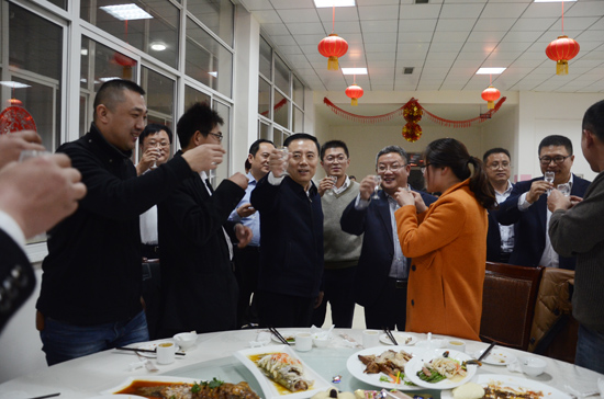 随后王谨董事长致祝酒词,王董事长首先代表公司董事会,向一直以来信任和支持荣信煤化的各级领导和朋友们,向与公司一道奋勇攀登的同事及家属,致以新春的祝福和崇高的敬意。王董事长指出,2015年,是荣信煤化奋力攀登的一年,是挑战极限的一年。在这不寻常的一年中,我们奋力拼搏,披荆斩棘。我们在砥砺前行中做到了同行业最好水平,党委政府、股东单位、社会各界为我们点赞!当2015年渐行渐远,回望一年来走过的路、越过的坎,才蓦然发现,身后的崎岖,在不知不觉中已抬升了我们的高度。